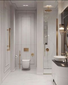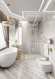 აბაზანის მოწყობისას გამოიყენეთ თეთრი ან კრემისფერი ფერები ასევე მოქროვილი ელემენტებიც გააფორმეთ ამგვარი გადაწვეტილებით შეზლებთ დასახული მიზნის განხორიცელებას ინტერიერის სიდიადის ხაზგასმის მიზნით, იატაკისთვის შეგიძლიათ გამოიყენოთ მარმარილო. მასიური მოოქროვილი ან ბრინჯაოს ჩარჩოებში სარკეები, კედლის კედლები და ჭაღები მისცემს აბაზანას განსაკუთრებულ ხიბლს.